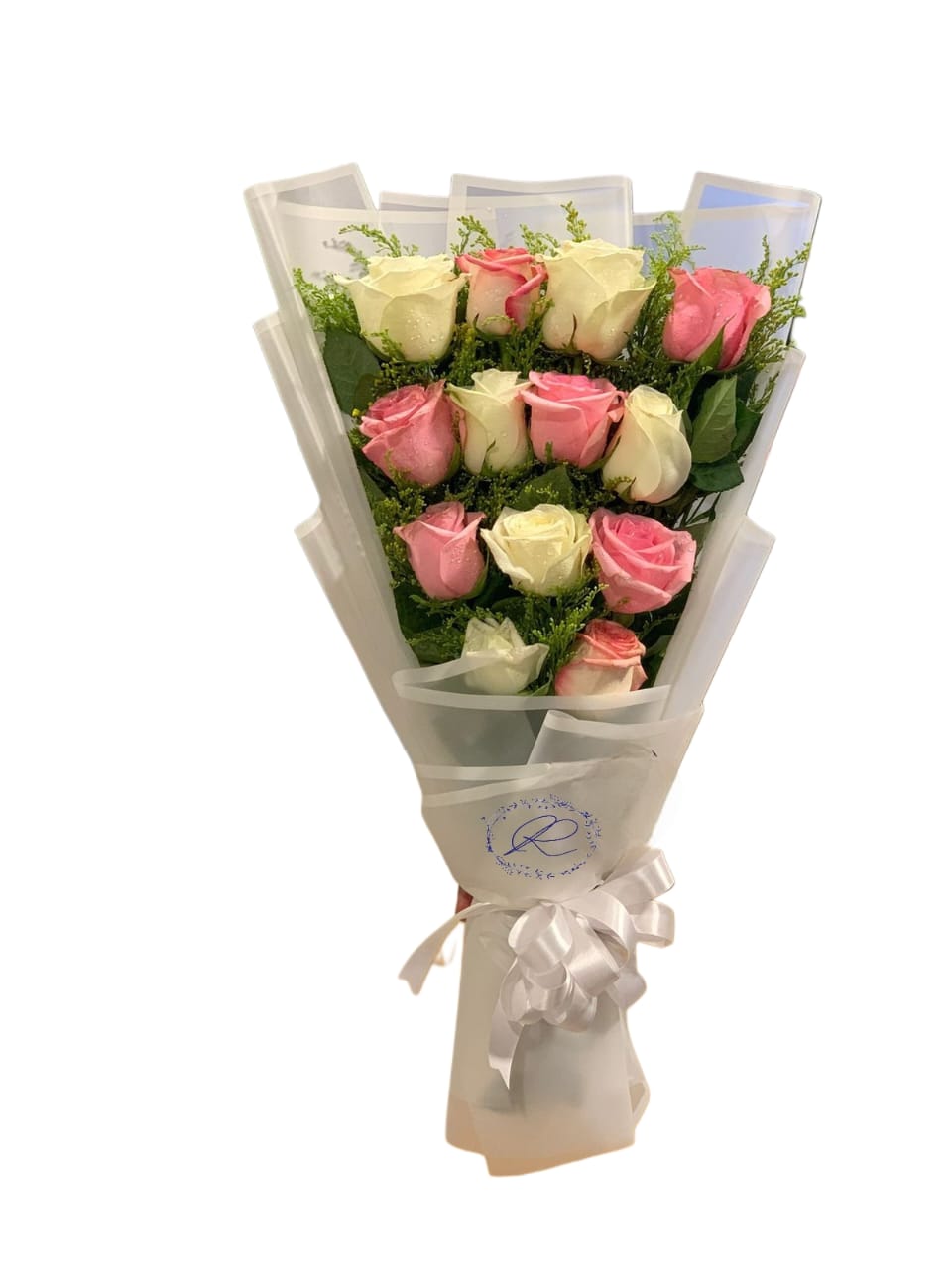 نقدم لكم باقة اليد، وهي عبارة عن ترتيب جميل تتميز 13 وردية فاتحة وابيض خاصة، ملفوفة بدقة في ورق أبيض نقي.