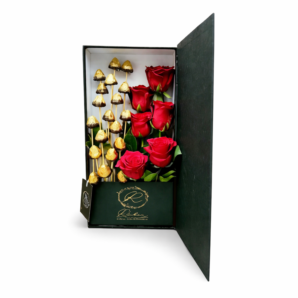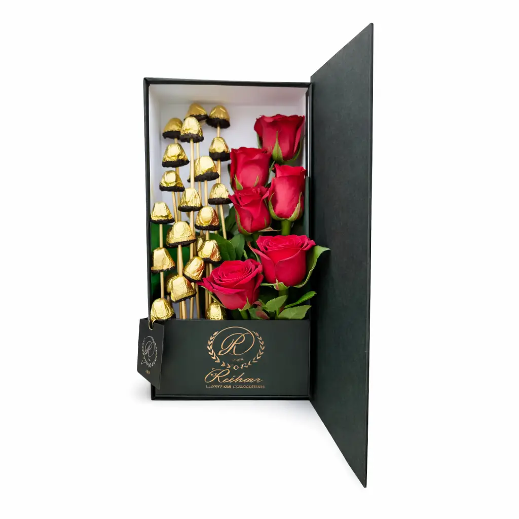 هذه الأزهار الرائعة هي سيمفونية للحواس ، محبة وصادقة.يحتوى المنتج على زهور جربيرا حمراء وبوكس اسود وشيكولاتة، إنه بريميوم بوكس.