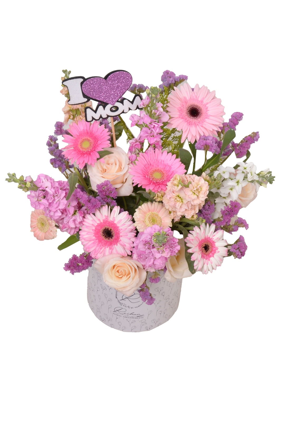 يتناغم الجربيرا الوردي المشرق مع الانترينا العطرة والاستاتس البنفسجي ولمسات المانتو الخضراء داخل بوكس أنيق يحمل لمسة فاخرة.