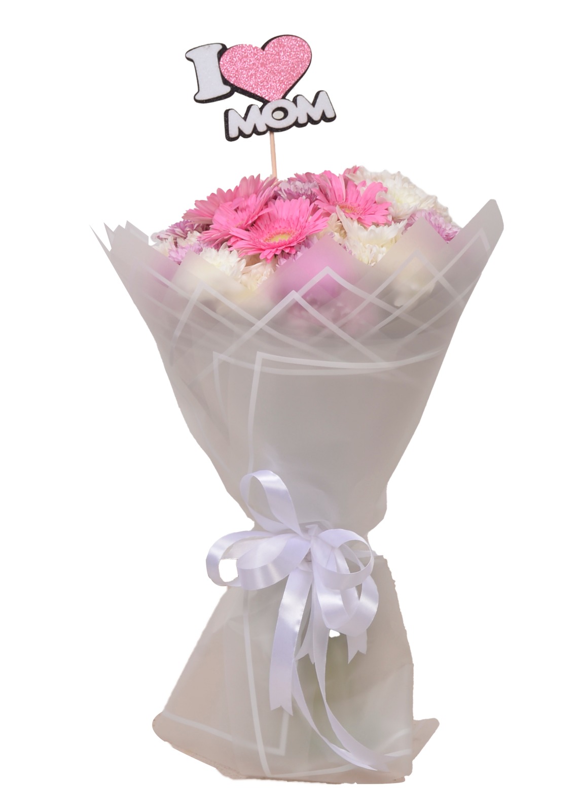 The flowers are carefully arranged in a stylish hand bouquet and finished with a charming “I ❤️ MOM” topper, making it a heartfelt Mother’s Day gift that expresses gratitude and love.
