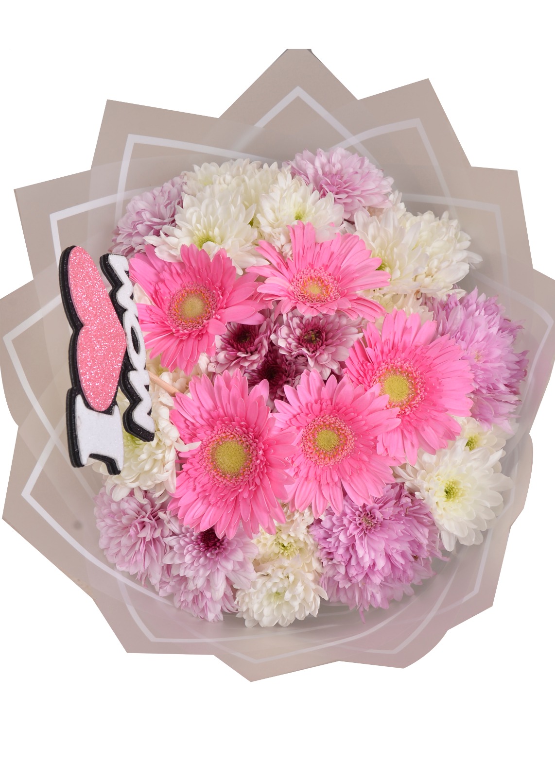 Gerbera flowers symbolize happiness, appreciation, and admiration, making them a perfect choice for celebrating mothers. The delicate chrysanthemums add fullness and softness to the bouquet, enhancing its elegant and graceful appearance.