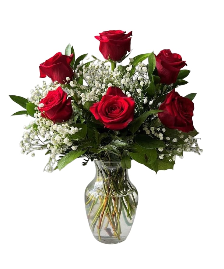 Express your love by presenting a bouquet of red roses in a romantic design decorated with two colored leaves, baby flower and green, adding a lot of warmth to the bouquet.