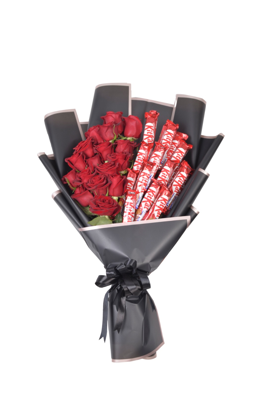 This luxurious bouquet brings together the timeless beauty of fresh red roses, symbolizing love and passion, with everyone’s favorite KitKat chocolate, creating a complete and irresistible gift.
