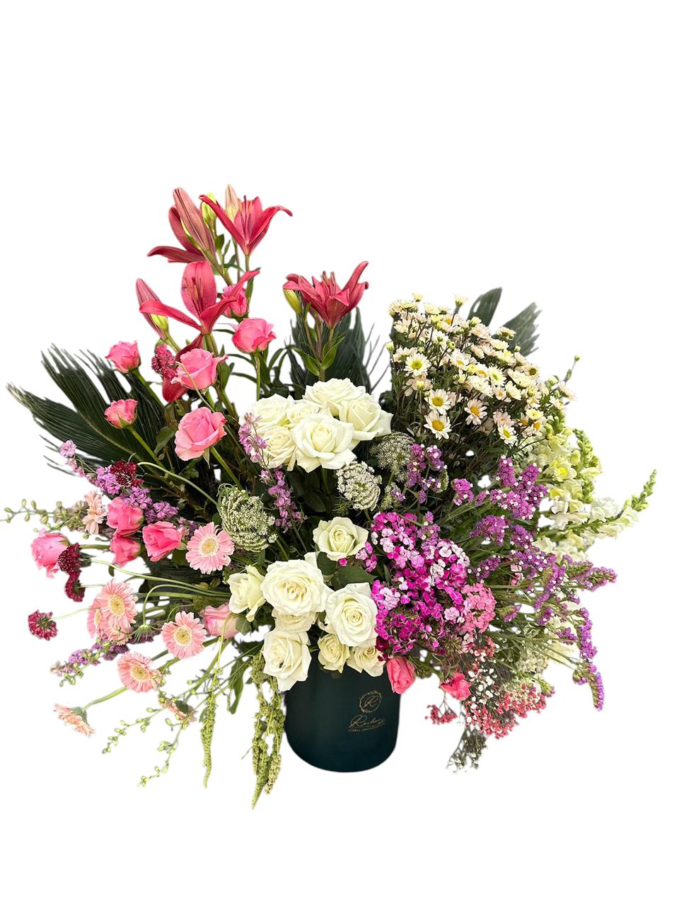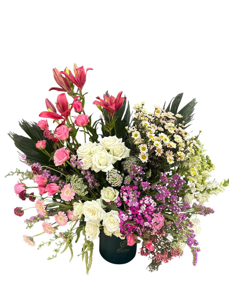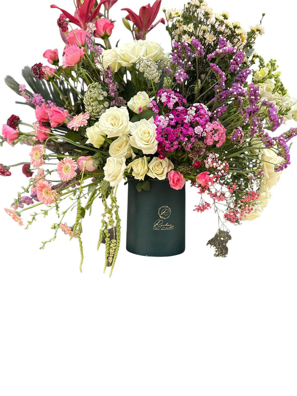 Experience a unique visual journey with the “Royal Garden” box, specially designed for sophisticated spaces and extraordinary occasions. This arrangement features deep-hued Lilies surrounded by a rich selection of white and pink Roses and delicate Gerberas. What sets this box apart is the fluid beauty of cascading Amaranthus stems, paired with the dense blooms of Chrysanthemum and Trachelium, bringing the spirit of raw nature into your home. Presented in a premium black cylindrical box, it creates a stunning contrast that defines modern elegance.