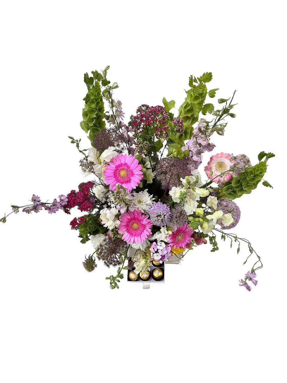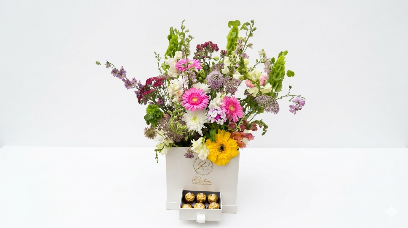 Impress your loved ones with the “Sweet Surprise” box, where elegance meets indulgence. This lush arrangement features vibrant Gerberas in pink and yellow, pristine Roses, and the wild beauty of Antirrhinum and Trachelium. Perfectly curated in our signature white box, it features a unique pull-out drawer holding gourmet chocolates. It’s a sophisticated sensory experience designed to make any celebration unforgettable.
