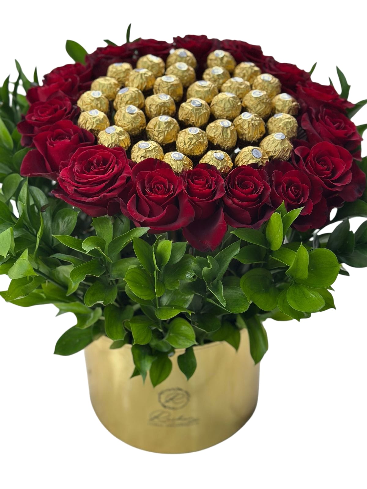 Express your love with bouquet – a wonderful arrangement of red roses and green leaves that give you a natural feeling, perfect for celebrating Valentine’s Day and expressing your feelings in a romantic way with the possibility of enhancing the bouquet and making it tickle the senses of your loved one, not just their feelings, with the addition of a special touch that reflects your taste and love by adding chocolate or a romantic balloon, or a scent